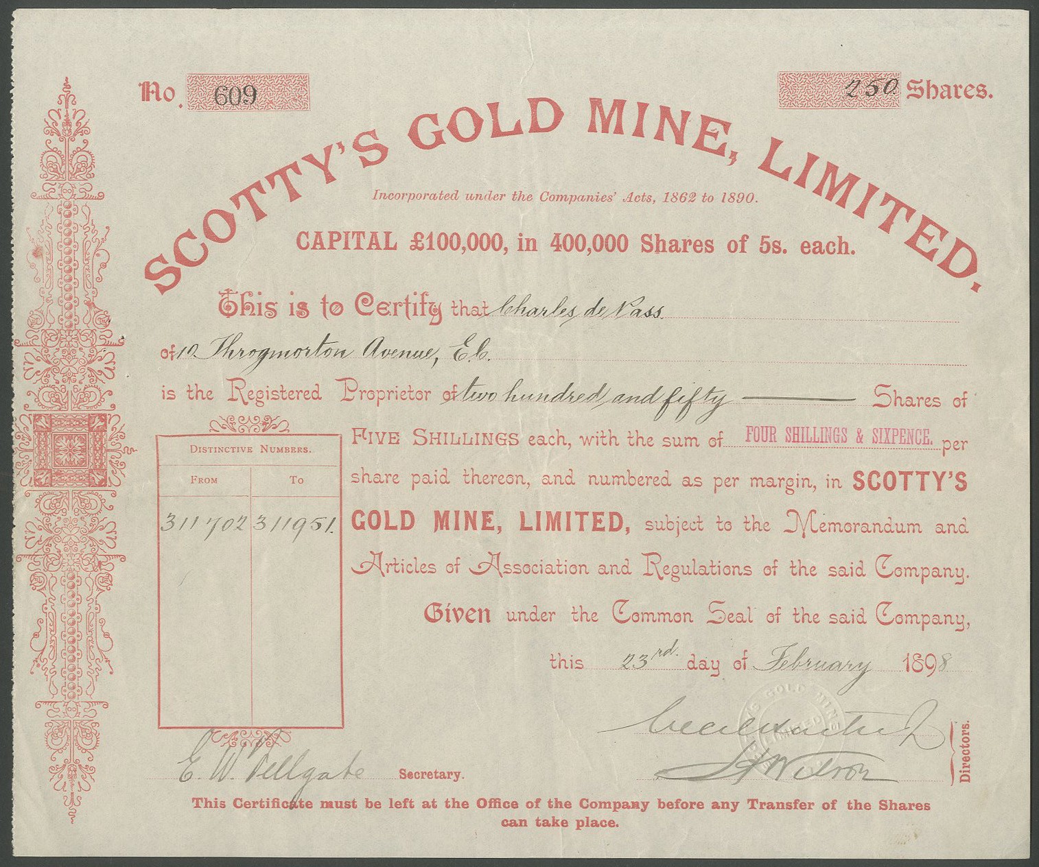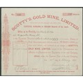 New Zealand: Scotty's Gold Mine Limited, 5 shilling shares, 4/6d paid, 189[8], #609, red. Registered 1897. A reconstruction of Scotty's Hauraki Gold Mining Company which owned a 19 acre property in the Coromandel District. EF.