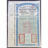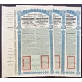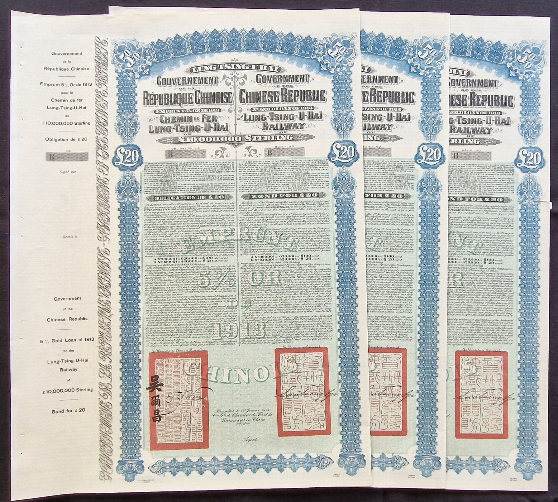 China: 1913 Lung Tsing U Hai Railway 5% Gold Loan, a group of 3 unissued £20 bonds, large format, blue, not numbered, with counterfoil. One with tear at right edge otherwise uncirculated (3).