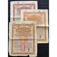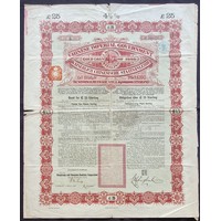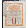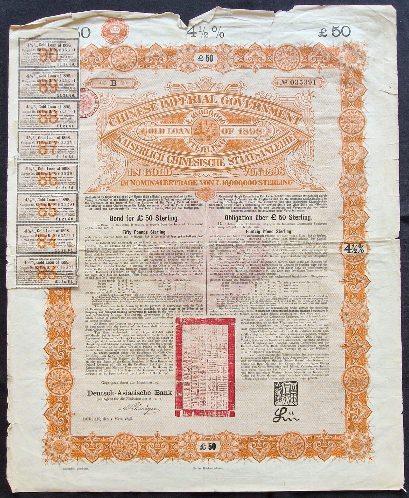 China: 1898, 4½% Gold Loan, £50 bond, #035391, issued by DAB, large format, ornate border, orange and black, chop in centre, with some coupons. Edge tears at top edge with minor paper loss but the body good condition, F-VF.