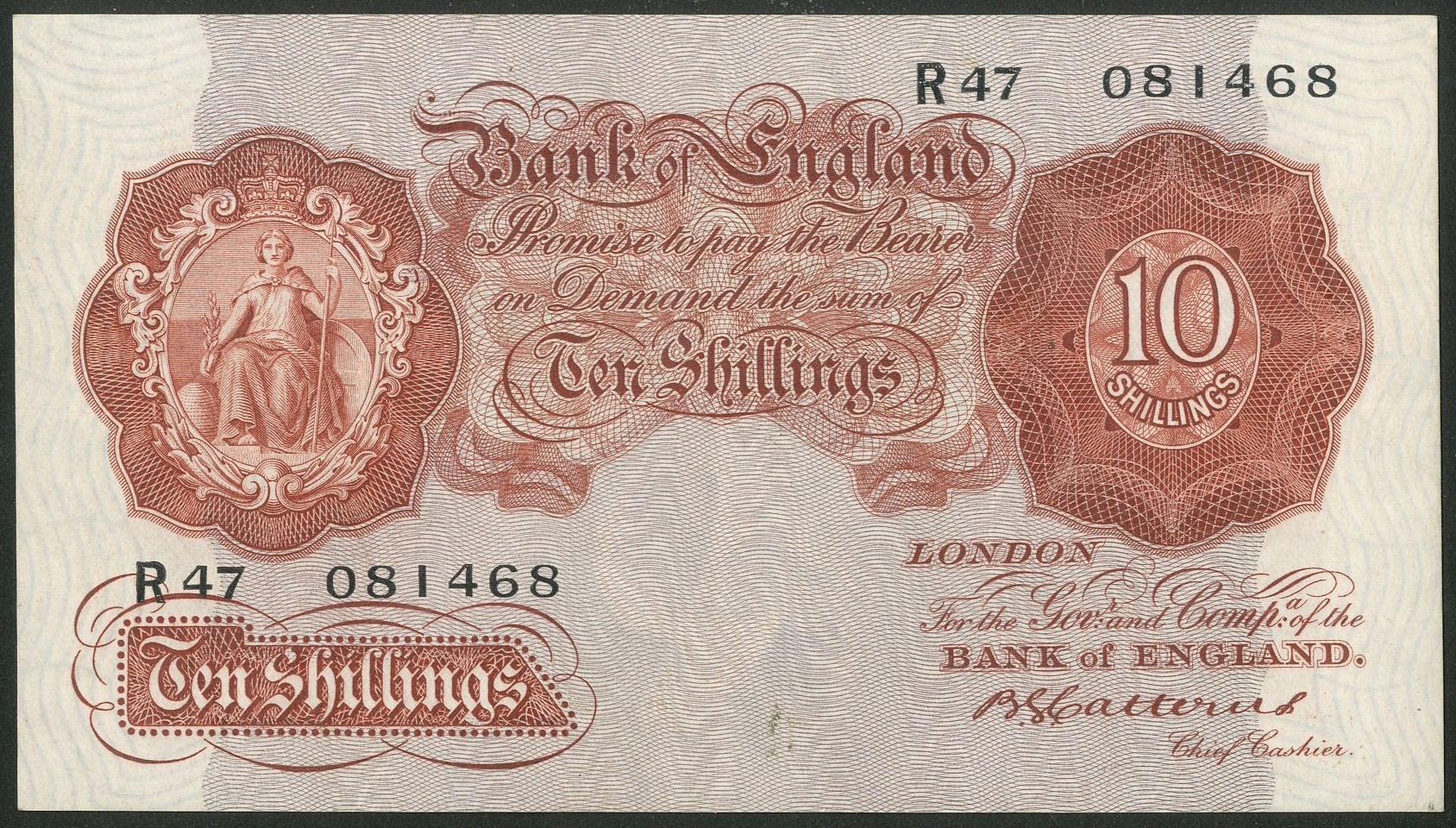 Bank of England, B.G. Catterns, 10 shillings, (1930), #R47 081468 (EPM B223). Pressed GVF.
