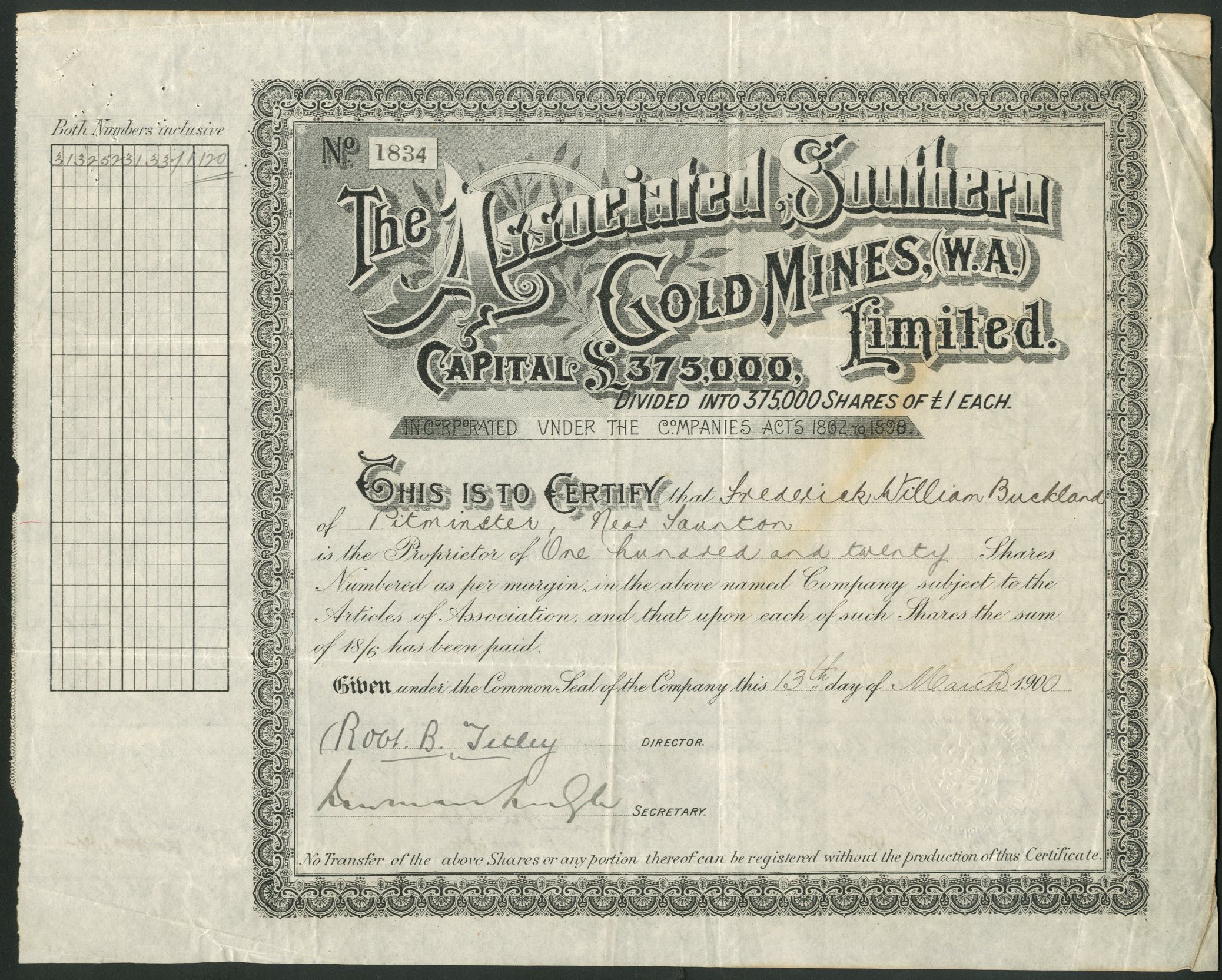 Australia: Associated Southern Gold Mines (W.A.) Limited, £1 shares, 190[0], #1834, ornate border, black. Formed as a reconstruction of a company of the same name first registered 1896 to acquire 15 leases in the Hannan's District of Western Australia. One lease was sold by the previous company to the Trafalgar Gold Mine (W. A.) Ltd. The new company set about preparing properties for sale but this seems to have proven unsuccessful with most of the original leases having been surrendered. The company acquired a property in the Gold Coast Colony in 1901 which was sold to the Atta Krukru (Wassau) Gold Mine Ltd. The company entered into an agreement with the Hannan's Trust Ltd to acquire new ground at Kalgoorlie and was reconstructed as the Corona Consolidated Ltd. Ragged left edge but VF.