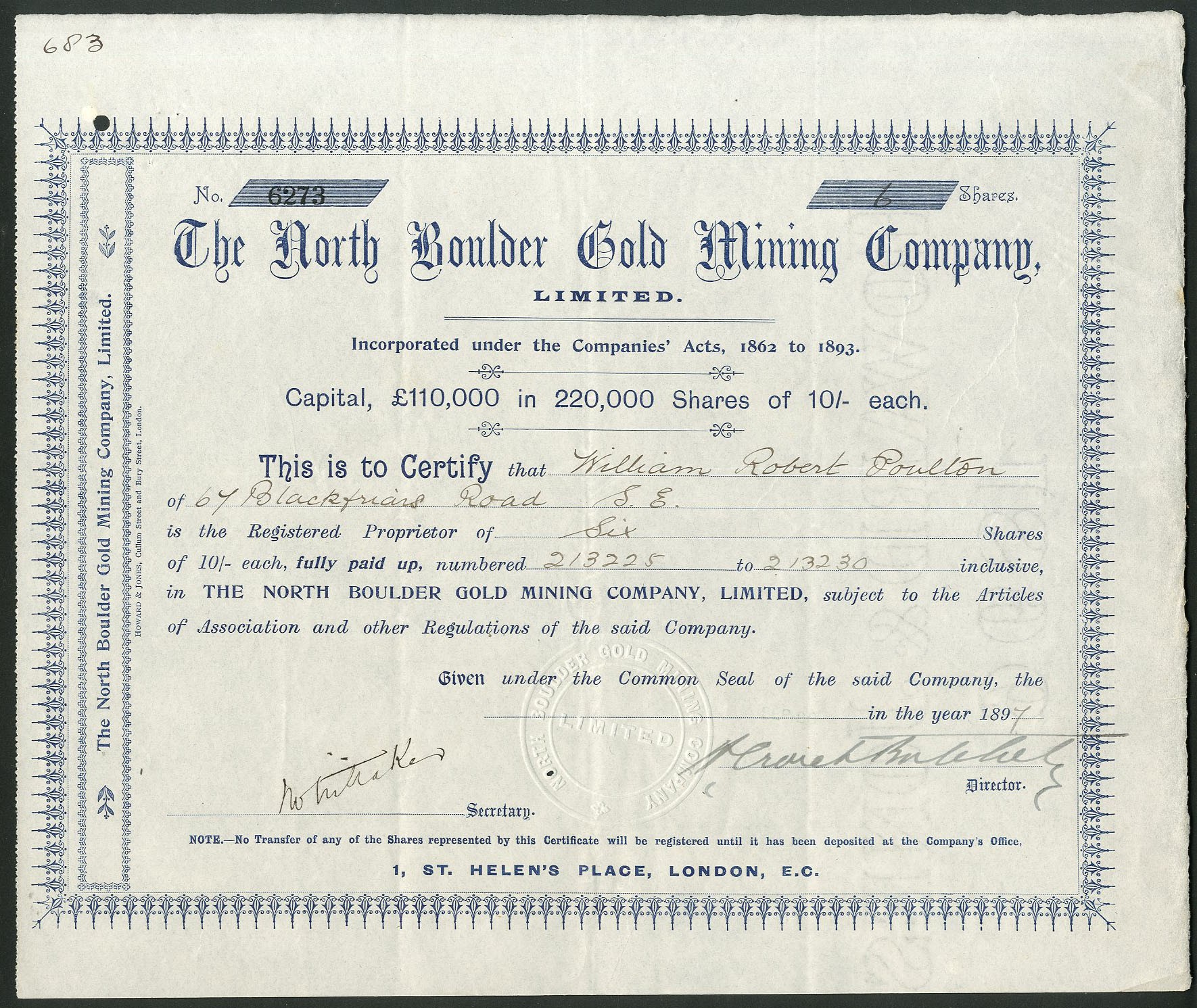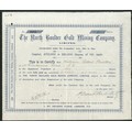 Australia: North Boulder Gold Mining Co. Ltd., 10/- shares, 189[7], #6273, blue. Registered 19th July 1895 to acquire the Eureka lease of 9 acres in the Hannan's District, Western Australia. GVF.