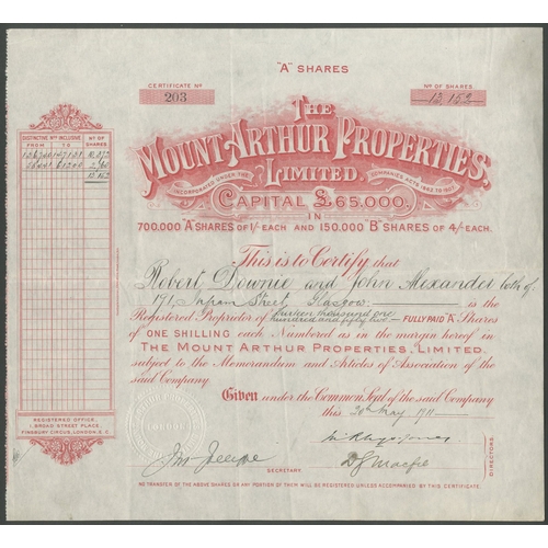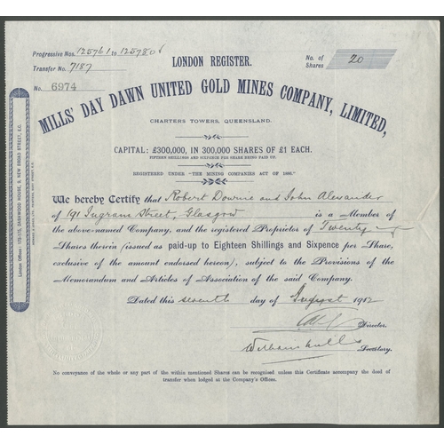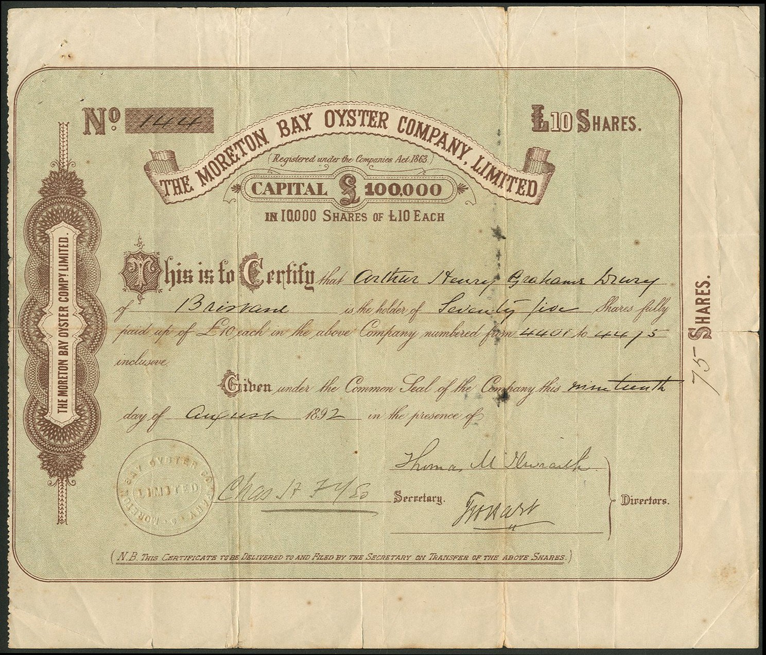 Australia: Moreton Bay Oyster Company Limited, £10 shares, 189[2], #144, brown, green underprint. Registered in Queensland to farm Oysters in Moreton Bay, Queensland. AVF and rare. First time at auction.