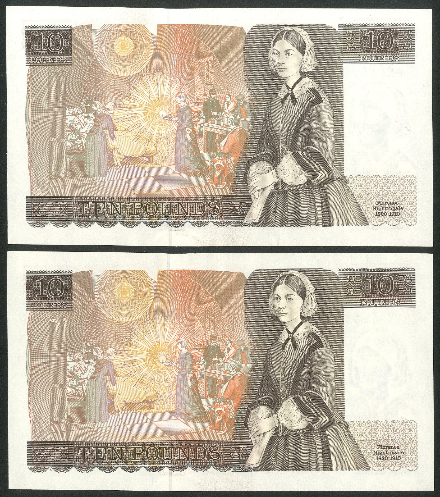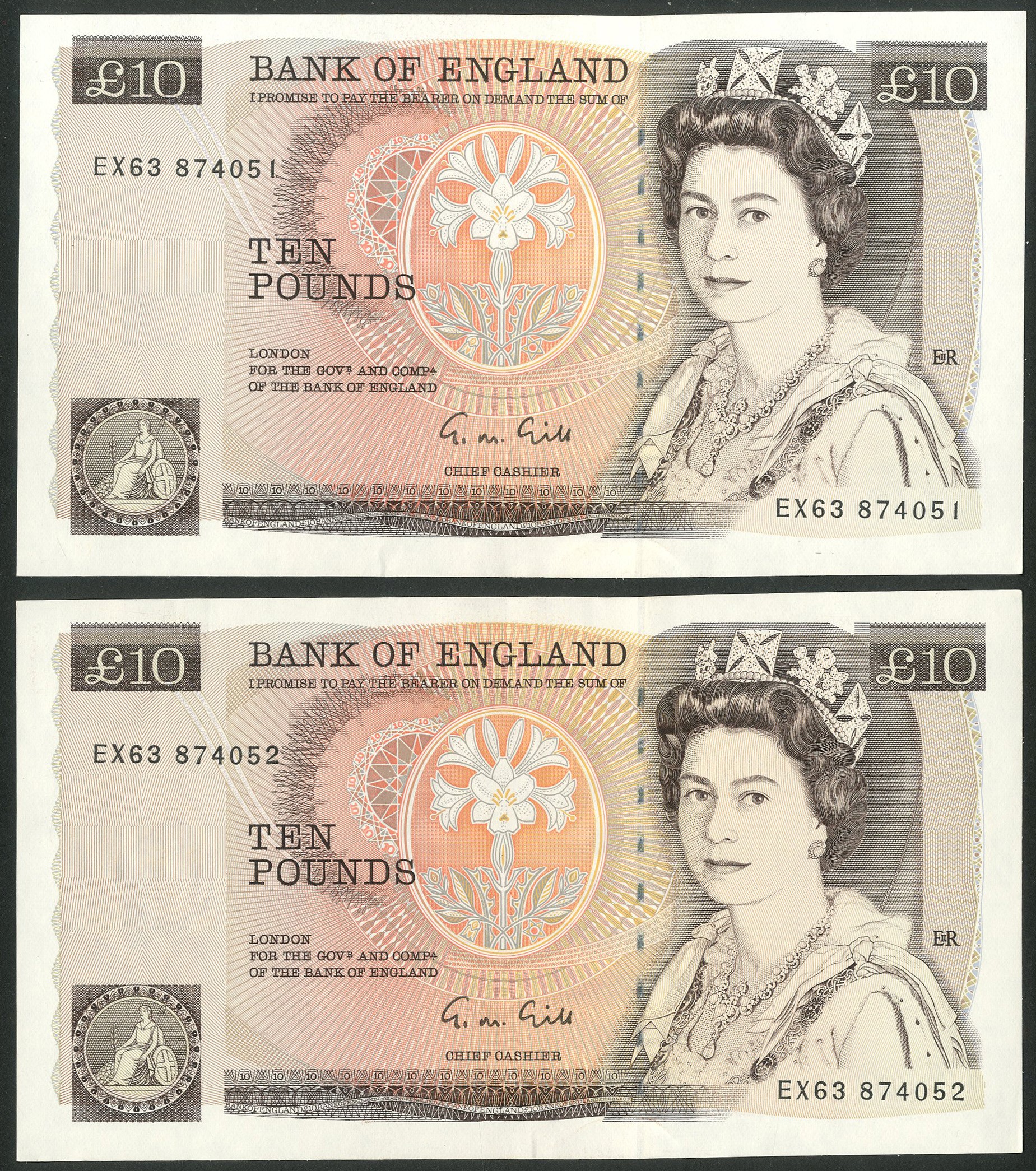 Bank of England, G.M.Gill, a consecutive pair of £10, ND (1988), 'L' reverse, EX63 874051 and 052 (Dugg. B354). Count flick by thread and light centre bend, GEF (2).
