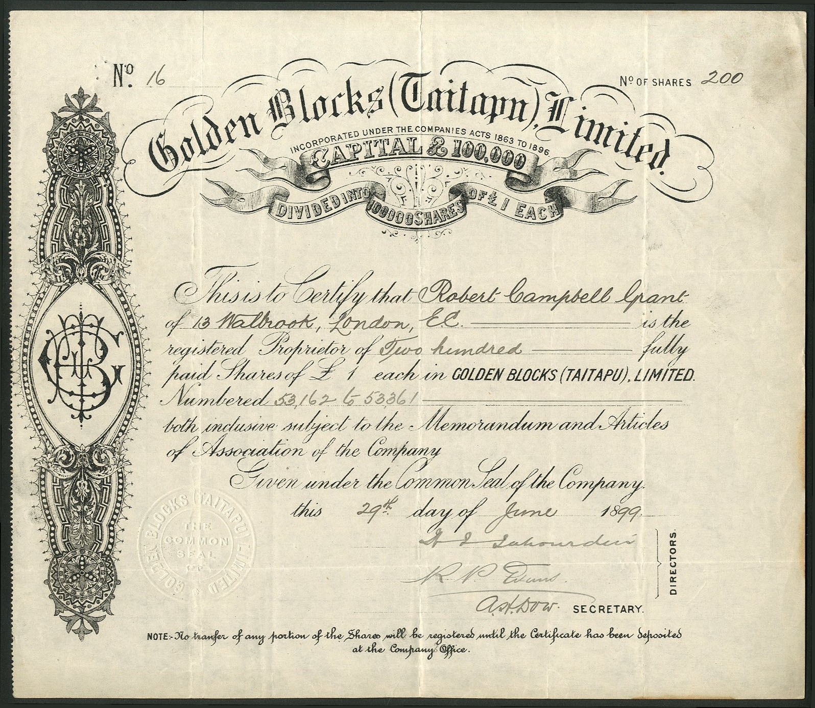 New Zealand: Golden Blocks (Taitapu) Limited, £1 shares, 18[99], #16, scrollwork at left, black. Registered in 1898 to acquire two 50 acre blocks and a mill site on the Taitapu Gold Estate, Middle Island, New Zealand. VF and scarce.