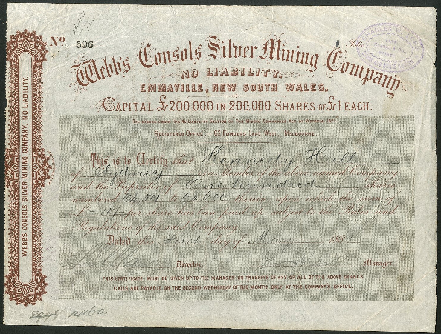 Australia: Webb's Consols Silver Mining Company, NL, £1 shares, 188[8], #596, brown with silver underprint. Mines at Emmaville, New South Wales. Creased, VF.