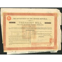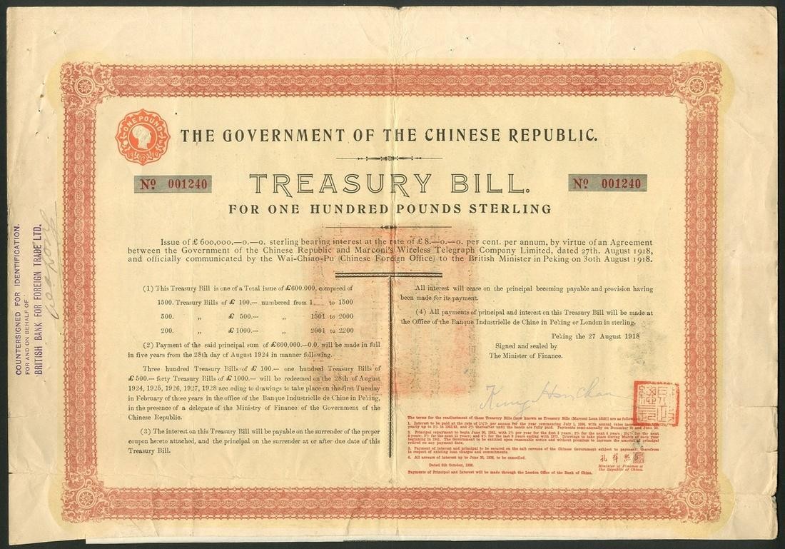China: 1918, 8% Treasury Bill 'Marconi' Loan, £100 bond, #001240, ornate border, red, yellow underprint, with coupons. Couple of edge splits and folds, otherwise VF.