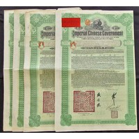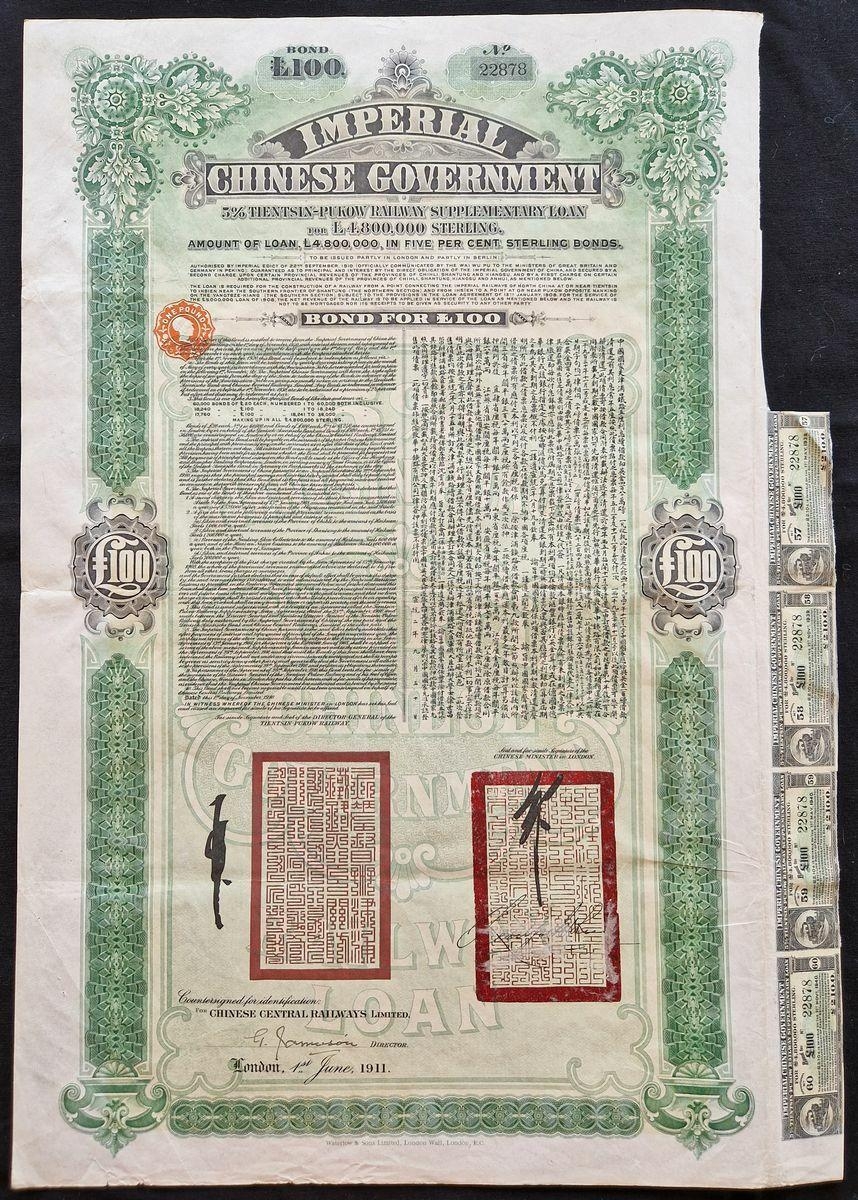 China: 1910 5% Tientsin-Pukow Railway Supplementary Loan, bond for £100, issued by Chinese Central Railways, #22878, large format, green, printed by Waterlow, with coupons. GVF.