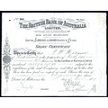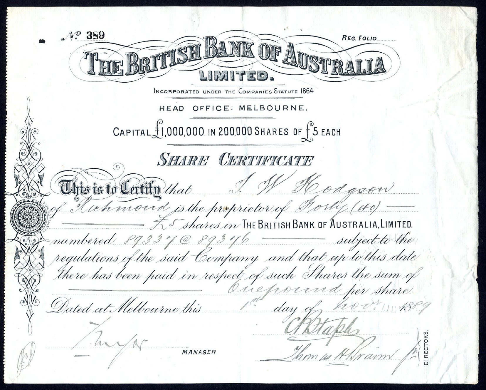 Australia: British Bank of Australia Limited, £5 shares, 18[89], #389, scrollwork left, black. Incorporated in Victoria in 1888 but suspended payment in 1891 due to the fall in real estate values and the general banking crisis. The bank did considerable business in Tasmania and a consequence of the failure of the Bank of Van Diemen's Land was a run on the company's branch in Launceston. VF and rare.