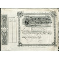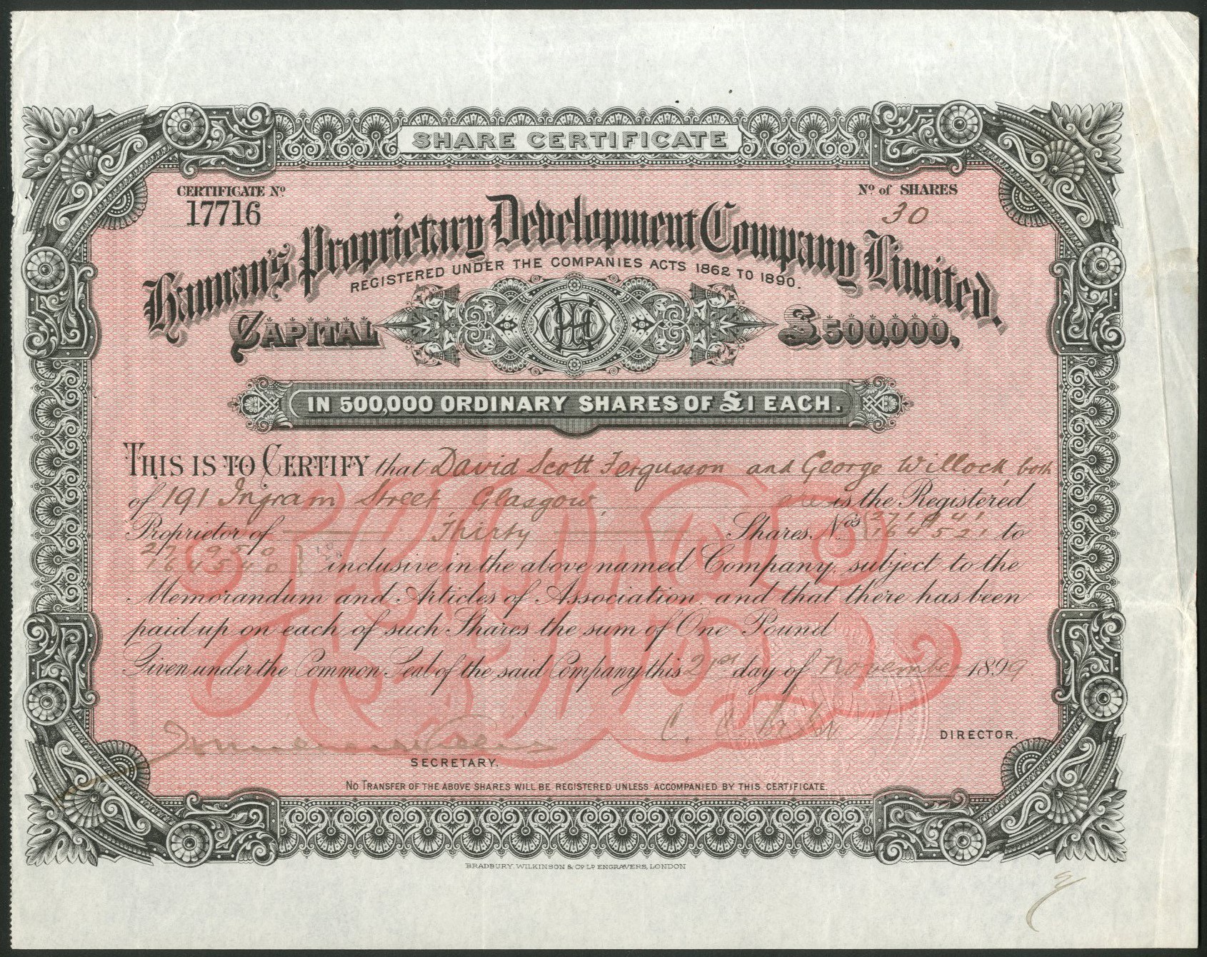 Australia: Hannan’s Proprietary Development Company Ltd., £1 shares, 189[9], #17716, black, red underprint. Registered 11th September 1895 to acquire about 500 acres on Hannan’s Goldfield, Western Australia. Reconstructed as Hannan’s Proprietary Limited in 1904. VF.