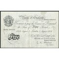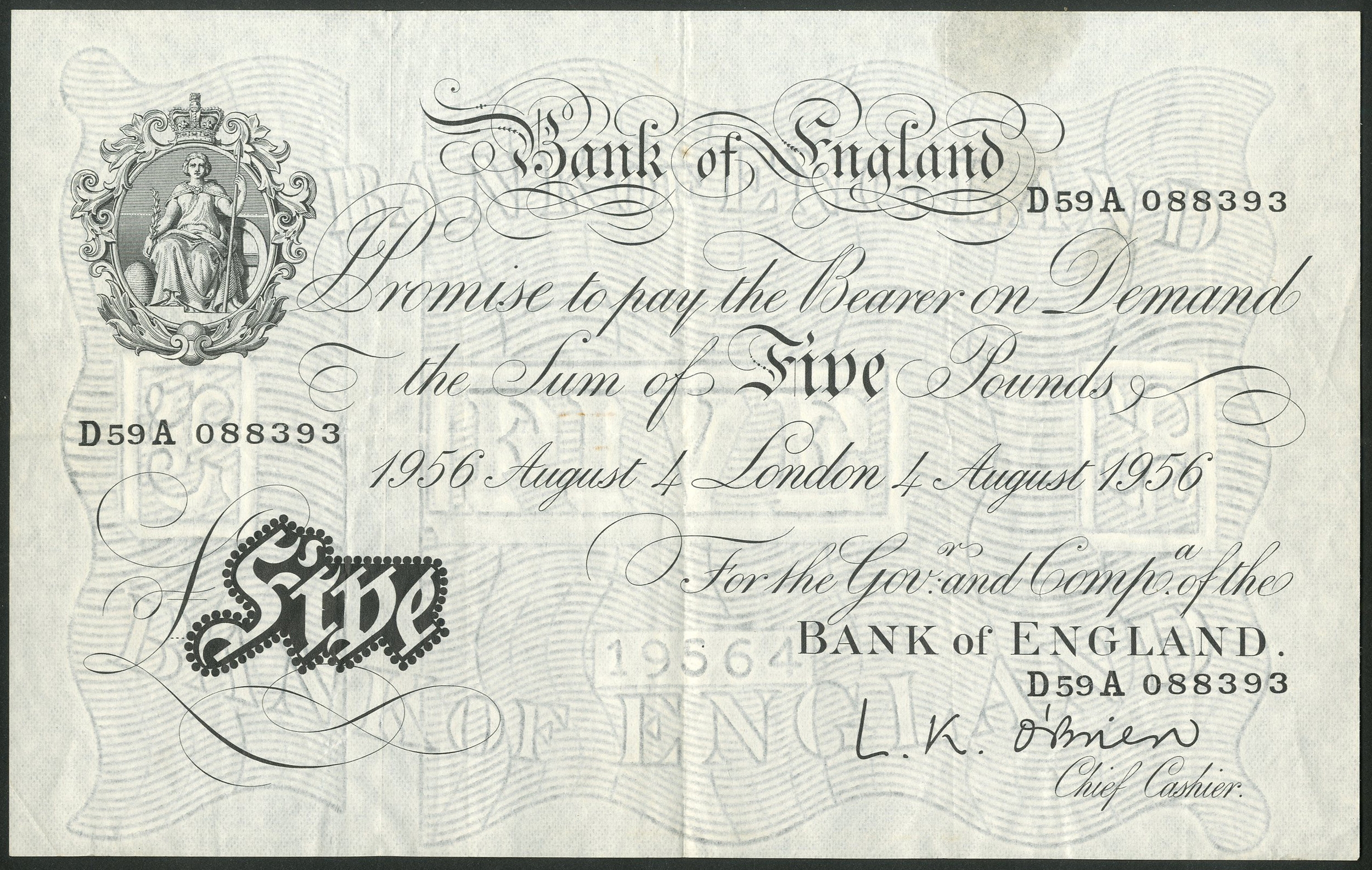 Bank of England, L. K. O'Brien, 5 pounds, 4th August 1956, #D59A 088393 (EPM B276). VF.