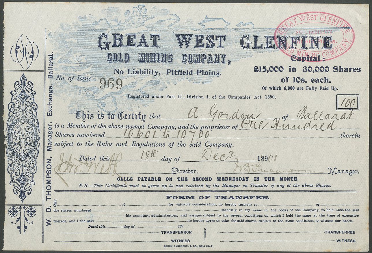 Australia: Great West Glenfine Gold Mining Company NL, 10 shilling shares, 189[1901], #969, blue. Mine at Pitfield Plains, 40km from Ballarat, Victoria. EF.