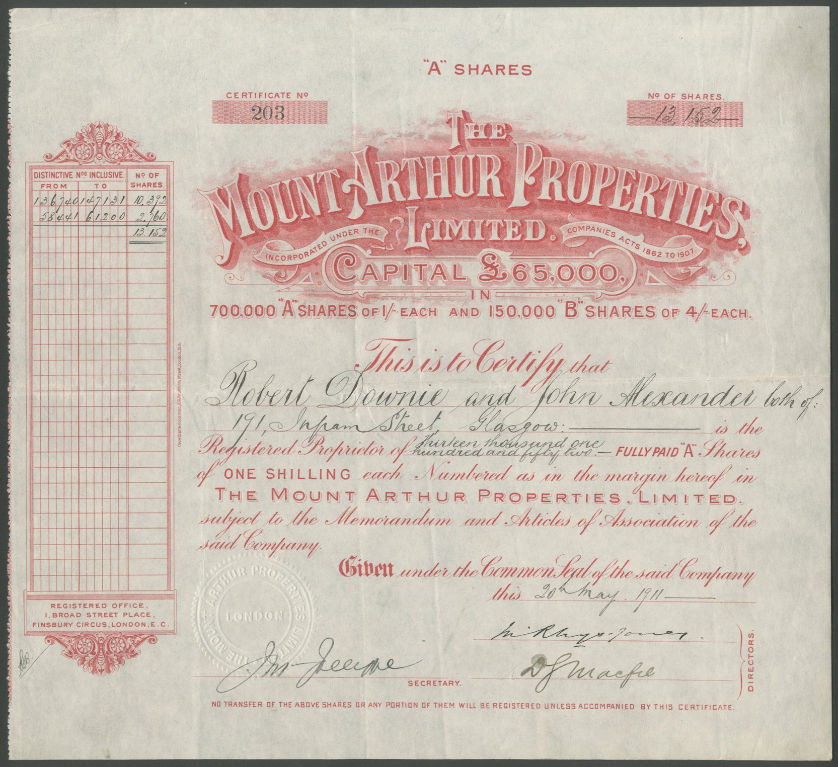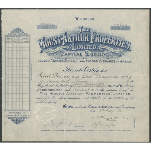 Australia: Mount Arthur Properties Ltd., 'A' shares, [1911], #203, red. A reconstruction of Tasmanian Consols Limited. Owned Crown leases of 75 acres at Mathinna, Cornwall, Tasmania. VF.