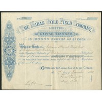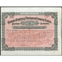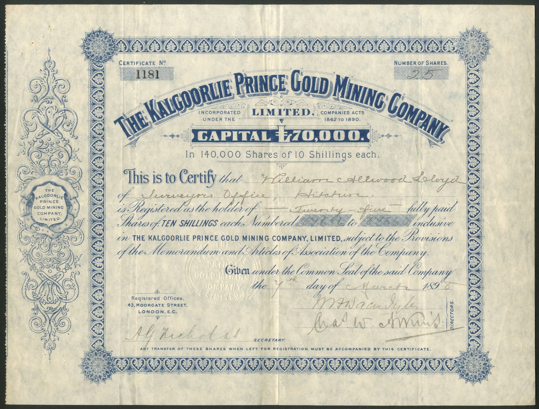 Australia: Kalgoorlie Prince Gold Mining Company Limited, 10 shilling shares, 189[8], #1181, blue. Registered 26th March 1895 as the Londonderry Extended Gold Mining and Exploration Company Limited to acquire an 18 acre claim in the Coolgardie Goldfield. This property proved unsatisfactory and in 1897 the Kalgoorlie Prince was acquired and the company name changed. VF and scarce.