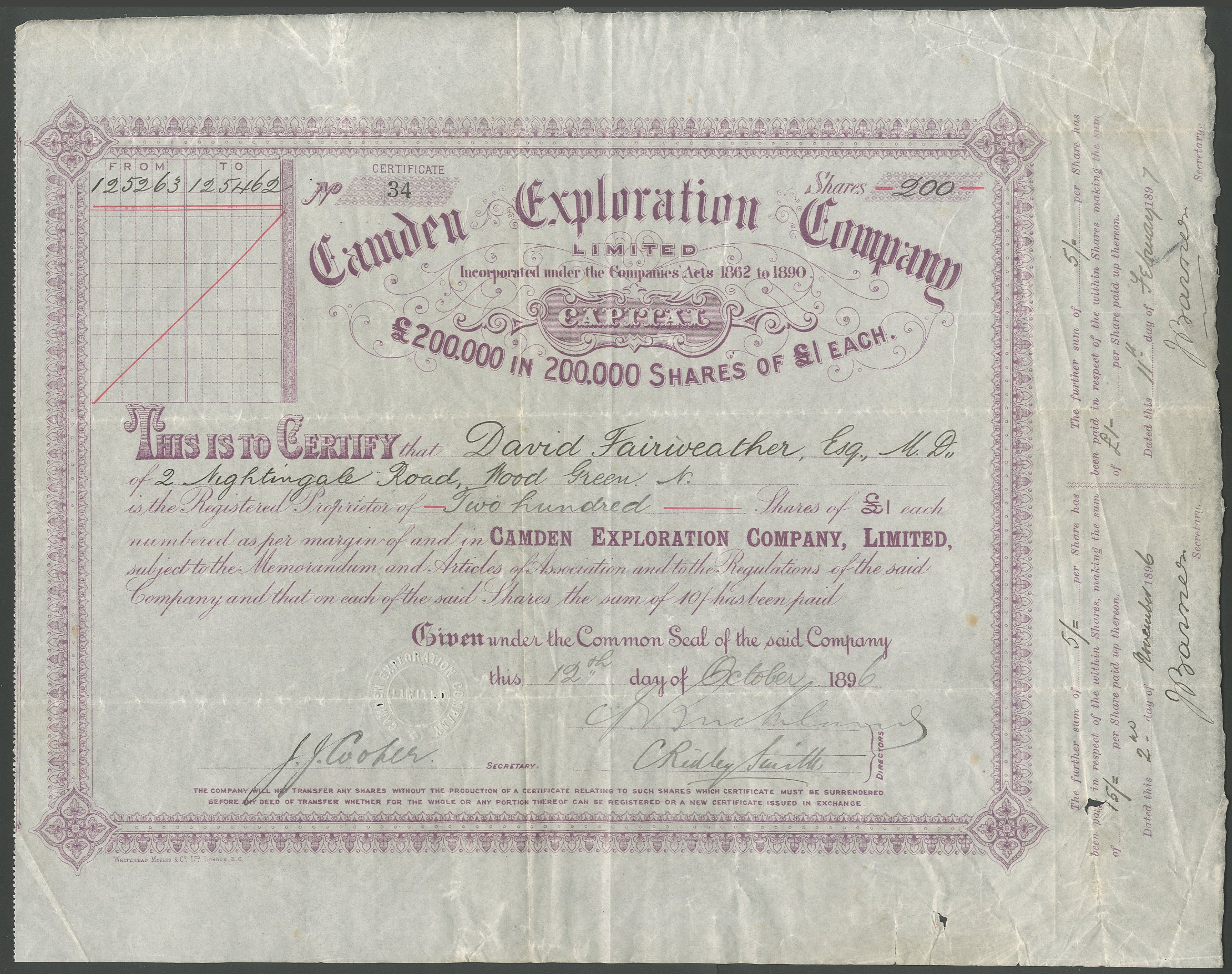 Australia (NSW): Camden Exploration Company Ltd., £1 shares, 189[6], 10/- paid, purple. Registered 18th June 1896 to take over the property of the Camden Syndicate Limited. Small tear and holes bottom right, VF.
