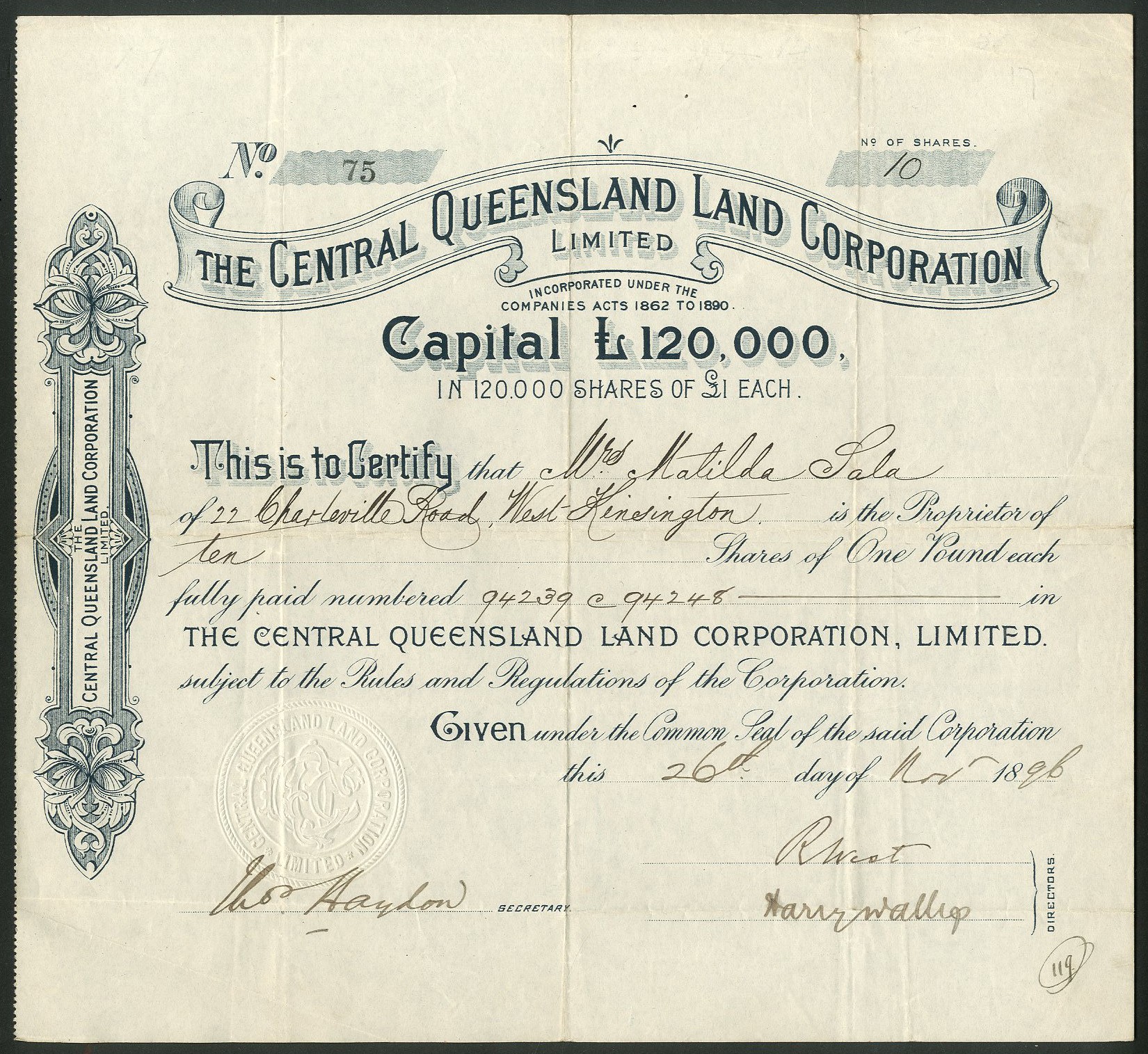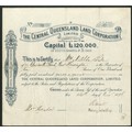 Australia - Queensland: Central Queensland Land Corporation Ltd., £1 shares, 18[96], #75, blue/black. Registered 17th August 1896 to acquire land in the district of Gladstone, Port Curtis, Queensland. Removed from register in 1907. VF.