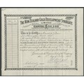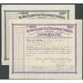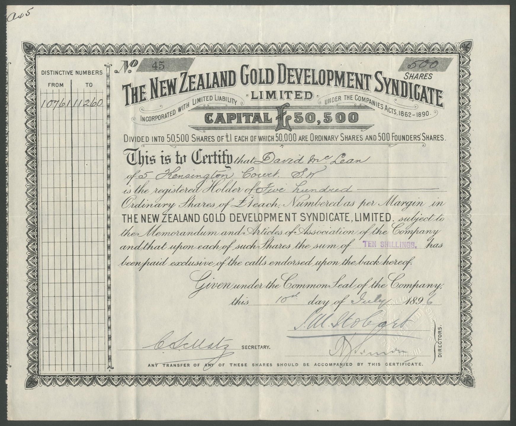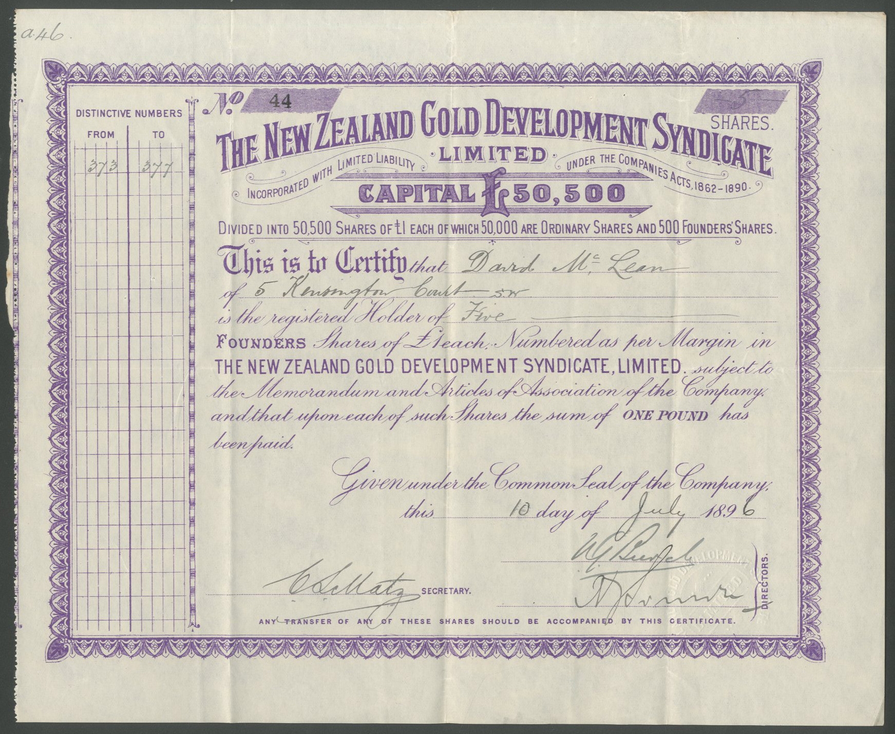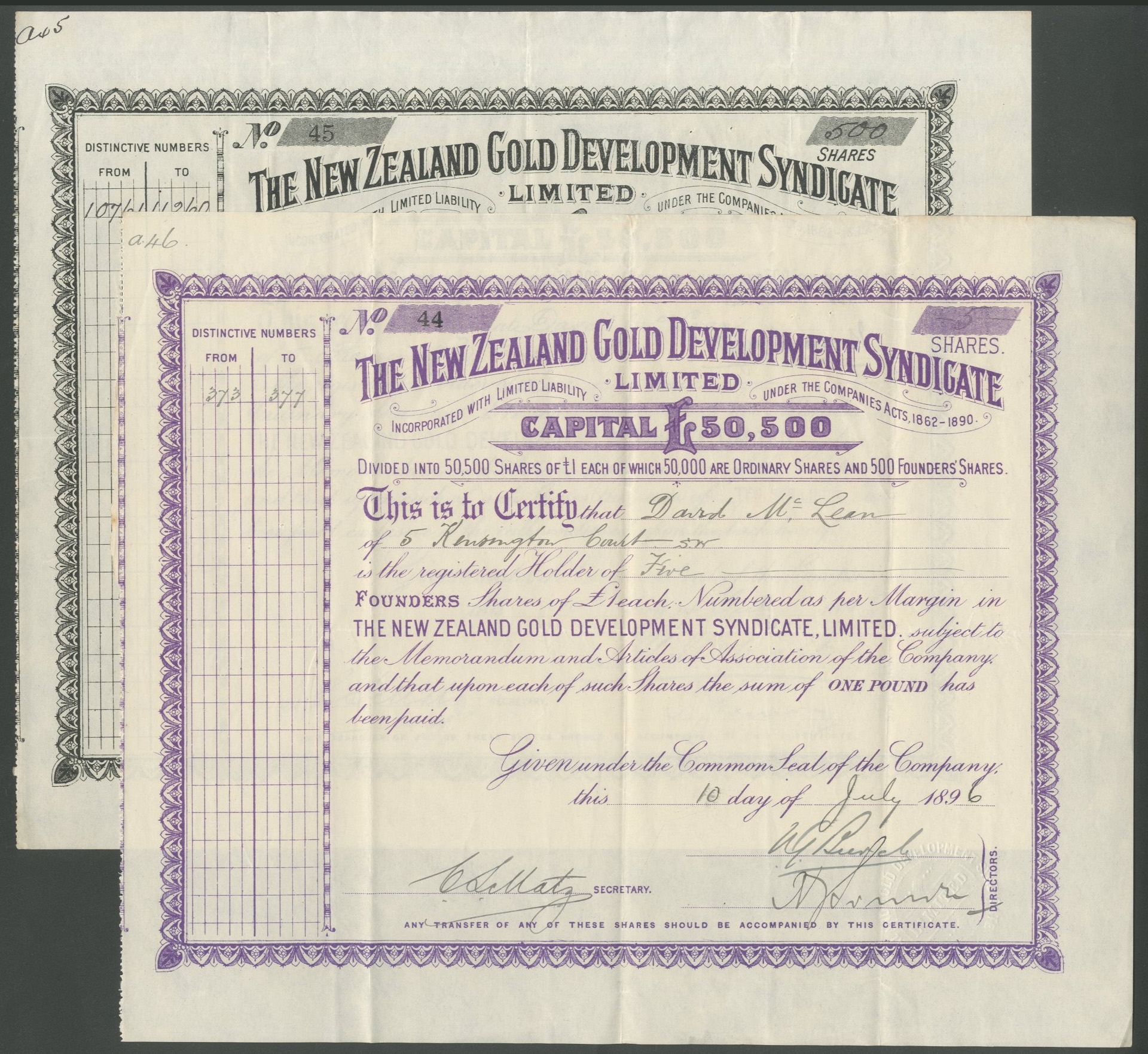 New Zealand: New Zealand Gold Development Syndicate Ltd., a pair of certificates; £1 ordinary shares and £1 founders shares, both 189[6], #45 and #44, black and purple respectively. Both VF. (2)