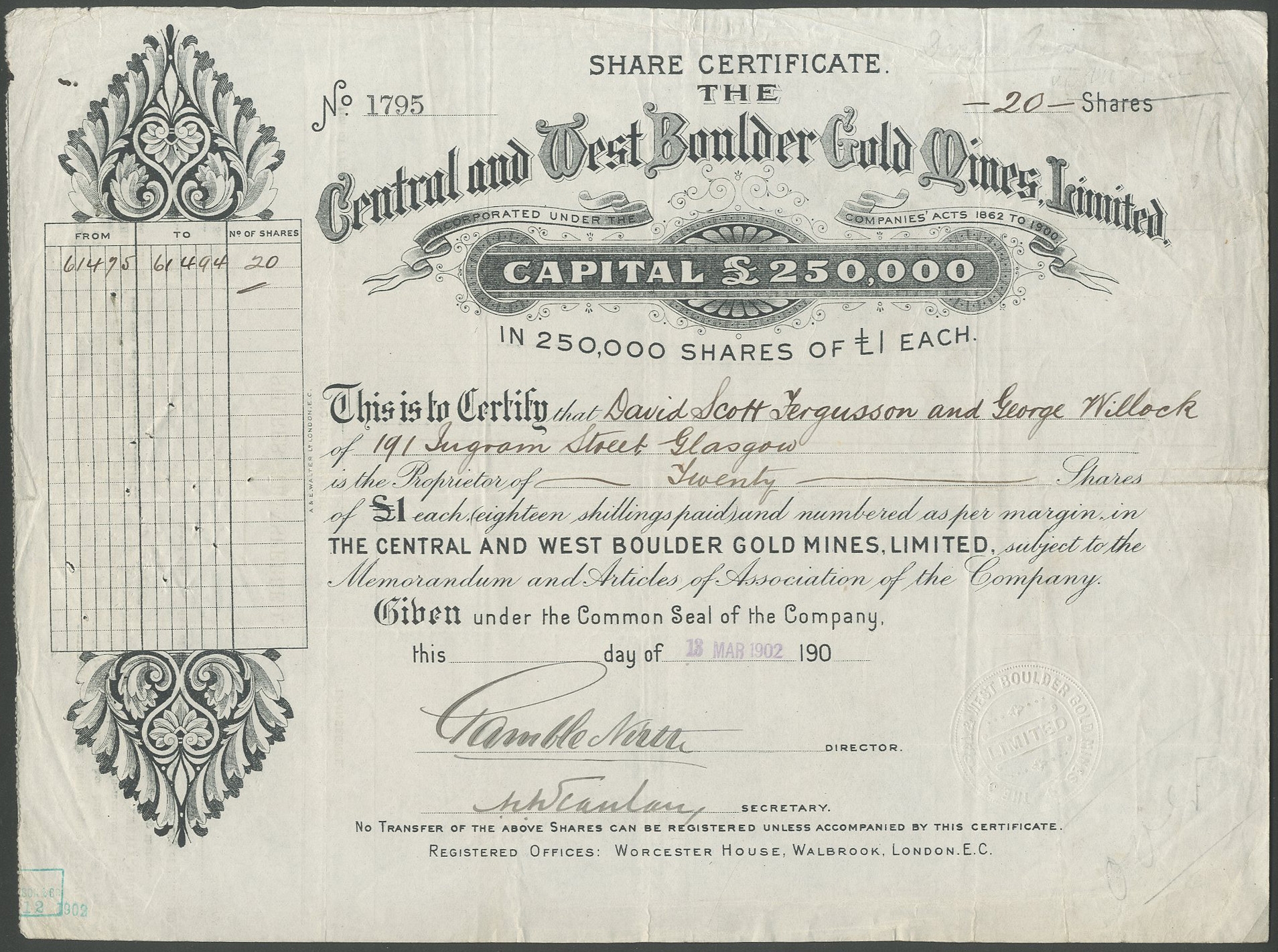 Australia: Central and West Boulder Gold Mines Limited., £1 shares, 190[2], #1795, black. Registered 22nd August 1901 as a reconstruction of the Central and West Boulder Gold Mines (W.A.) Ltd. Gold mines at Hannan’s Find, Kalgoorlie, Western Australia. AVF.