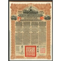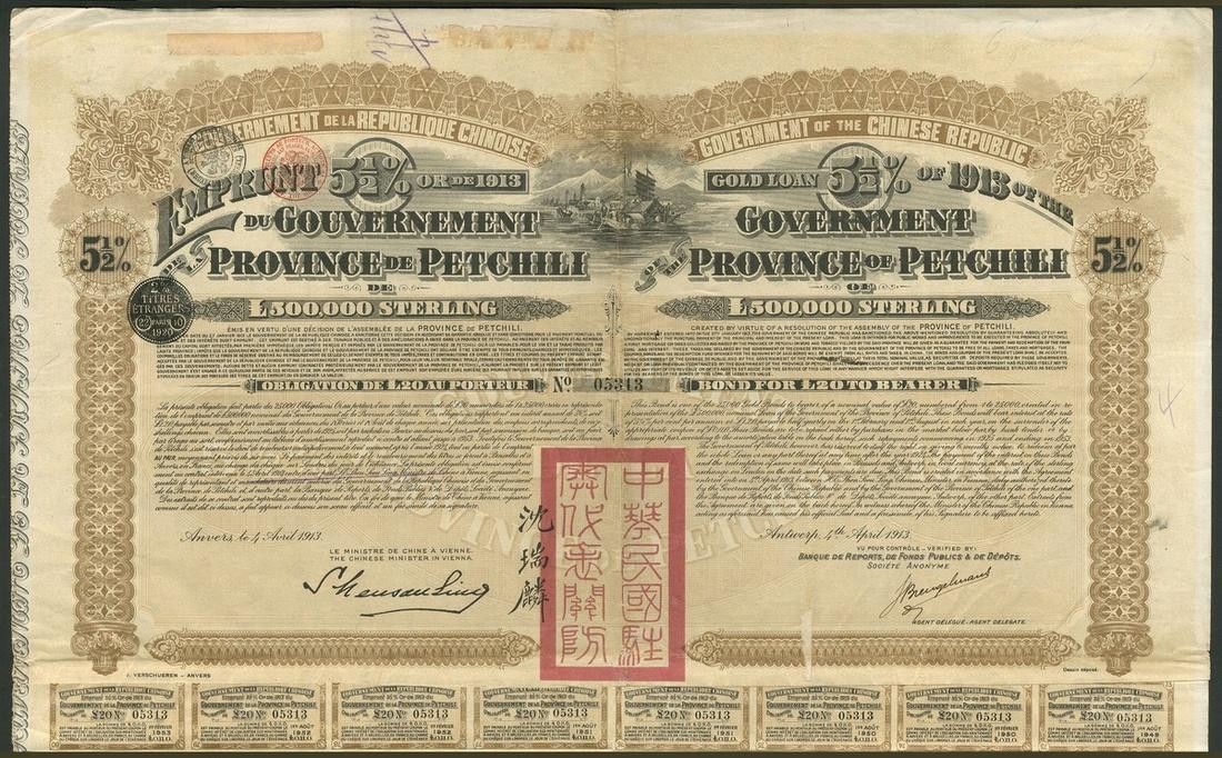 China: 1913 5½% Gold Loan of the Province of Petchili, bond for £20, Antwerp, #05313, text in French and English, very large format, red 'chop' at bottom, ornate border, vignette at top of Chinese shipping scene, brown and black, with coupons. AVF.