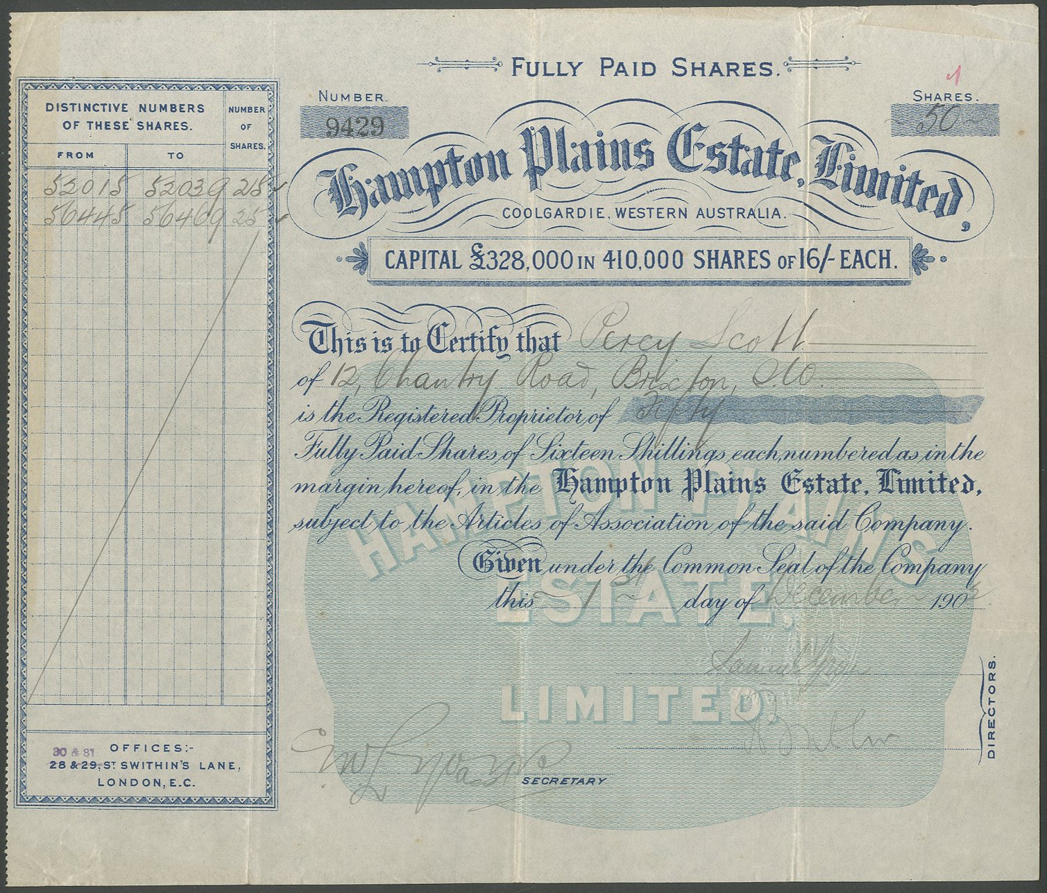 Australia: Hampton Plains Estate Limited., 16/- shares, 190[2], fully paid, #9429, blue with green underprint. Western Australia. VF.