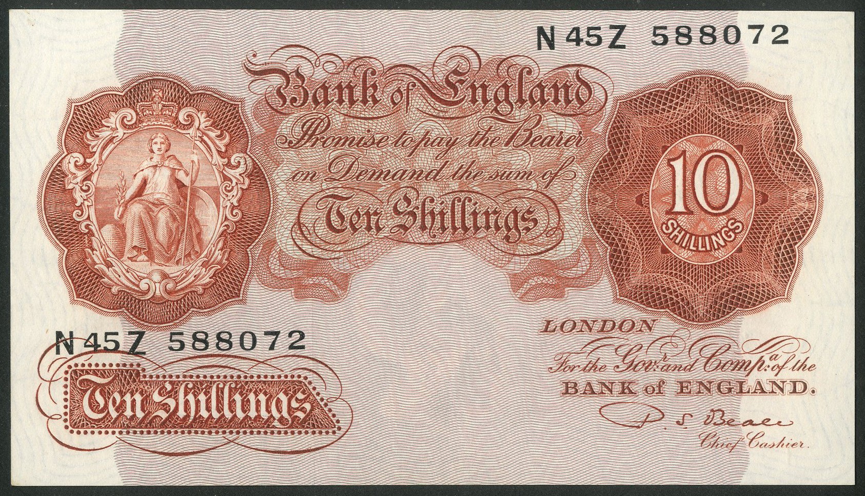 Bank of England, P. S. Beale, 10 shillings, (1950), #N45Z 588072 (EPM B266). AUNC.