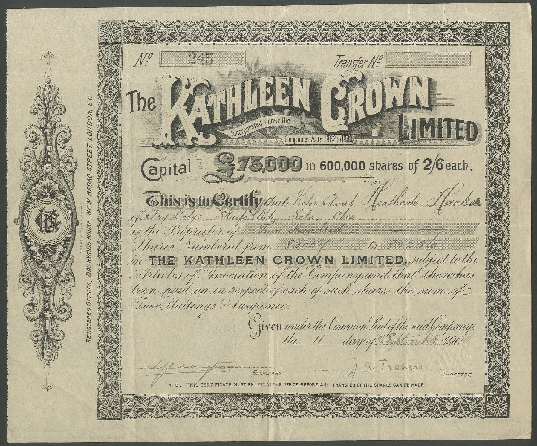 New Zealand: Kathleen Crown Limited, 2/6d shares, 2/2d paid, 190[0], #245, black. Registered 16th May 1900. Formed as a reconstruction of a company of the same name. Acquired the Pukepoto block of gold mines, Hauraki district, New Zealand. VF.