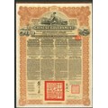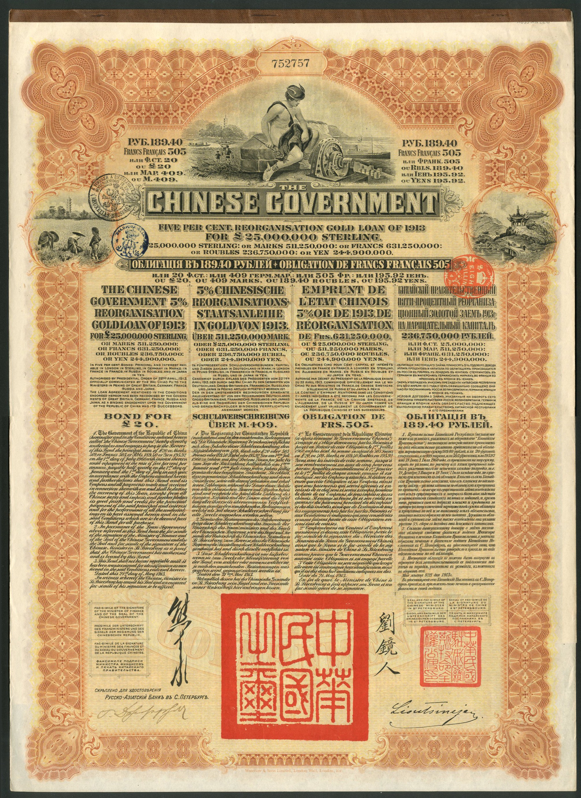 China: 1913 5% Reorganisation Gold Loan, bond for 189.40 rooubles, #752757, issued by the Russo Asiatic Bank, Mercury at top, brown, with coupons. EF