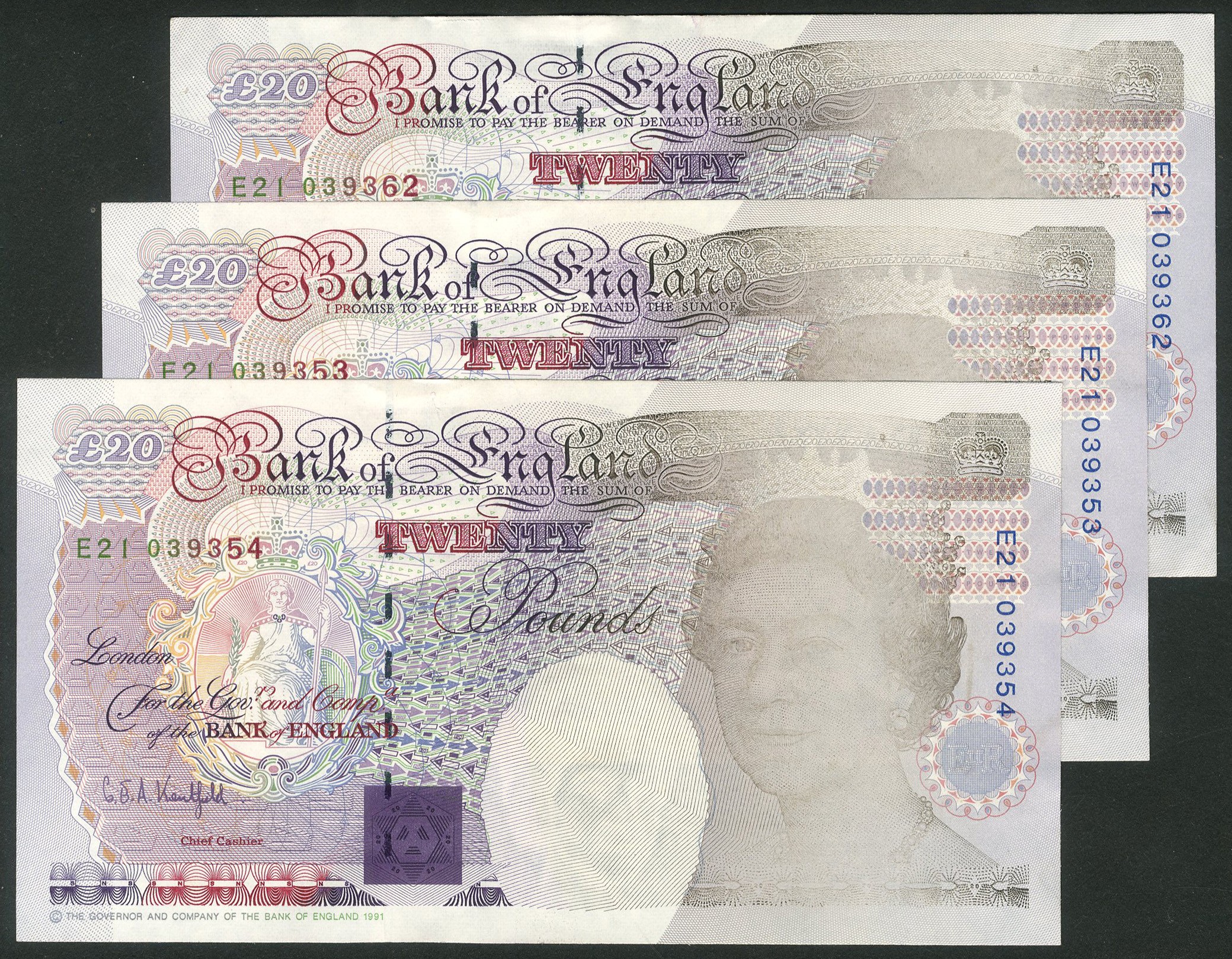 Bank of England, G.E.A.Kentfield, £20, ND (1991), a group of 3 error notes, all E21 series showing very faint ink on the Queen's head (Dugg.B371). 2 consecutive are AUNC, the other VF (3).