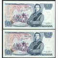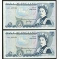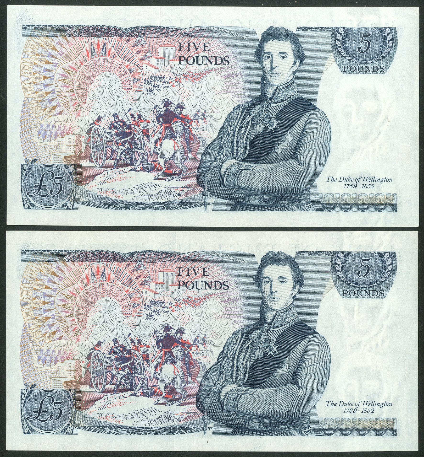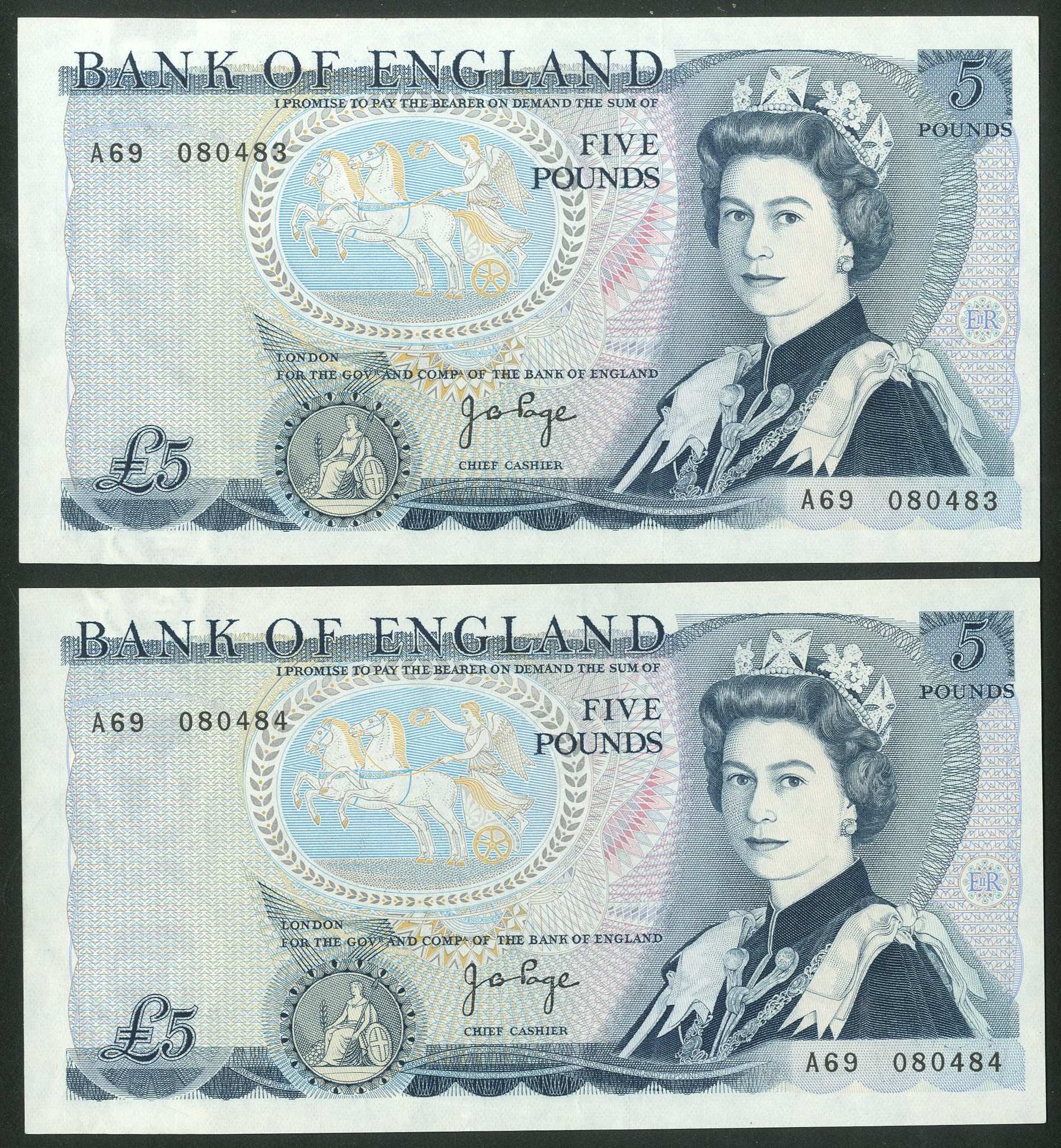 Bank of England, J. B. Page, 5 pounds, (1971), consecutive pair of first series, #A69 080483 and 484 (EPM B332). Crinkled at left, AUNC (2).