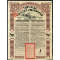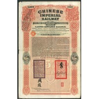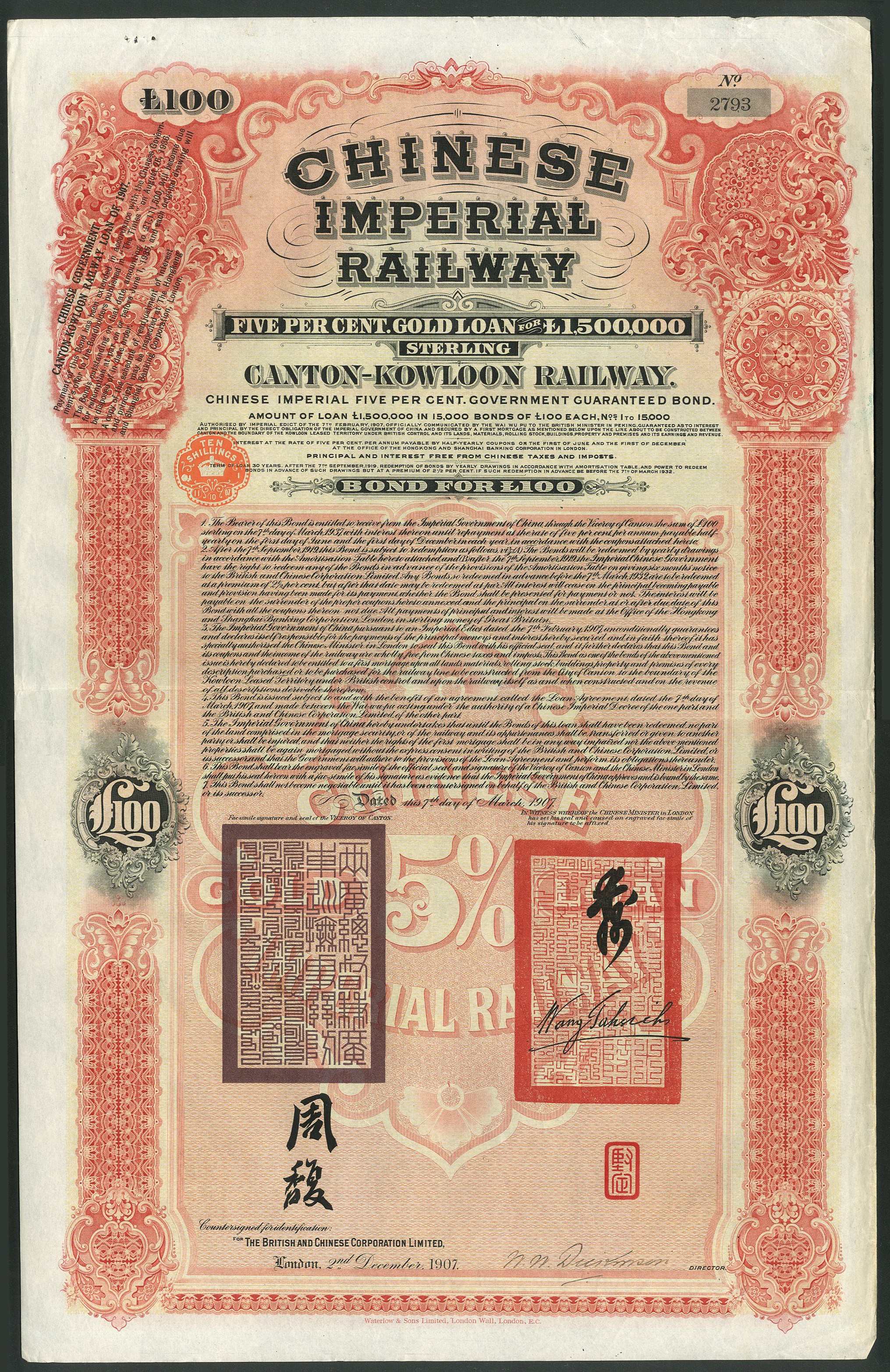 China: 1907 Canton-Kowloon Railway 5% Gold Loan, bond for £100, #2793, large format, red and black, printed by Waterlow, with coupons. EF.