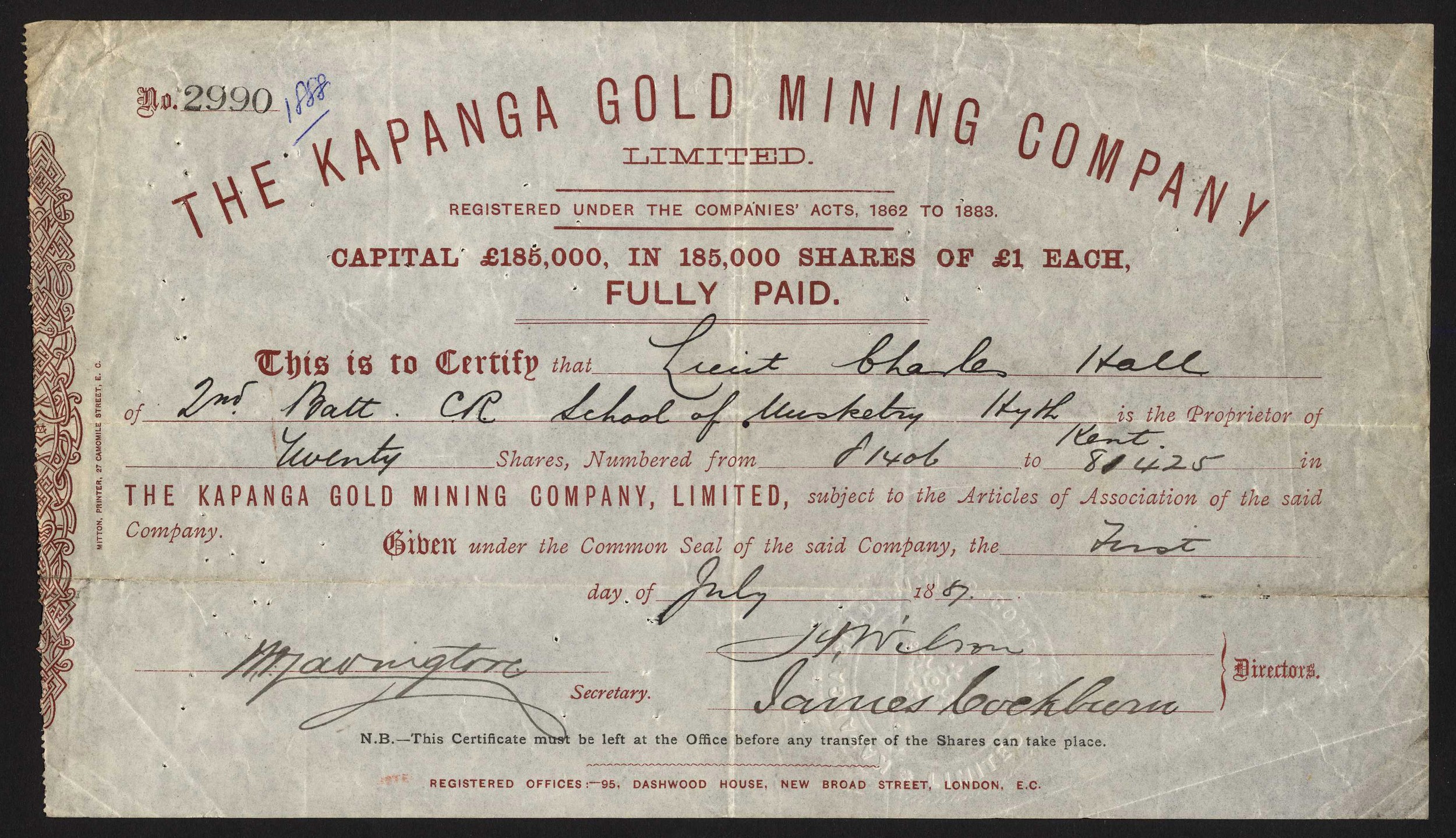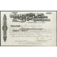 New Zealand: Kapanga Gold Mining Company Limited, £1 shares, 18[87], #2990, brown. Formed as a second reconstruction of the New Zealand Kapanga Gold Mining Co., Ltd. being registered in 1872 and first reconstructed in 1880 as the Kapanga Gold Mining Co., of New Zealand Ltd. In 1891 the property of the Coromandel Gold Co., Ltd. was acquired. The company was again reconstructed in 1893 under the same name. VF.