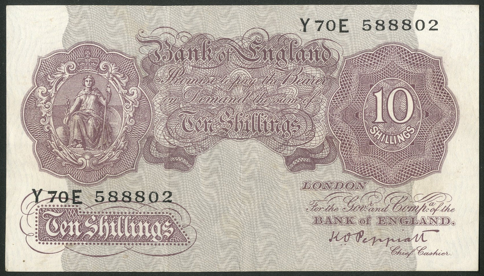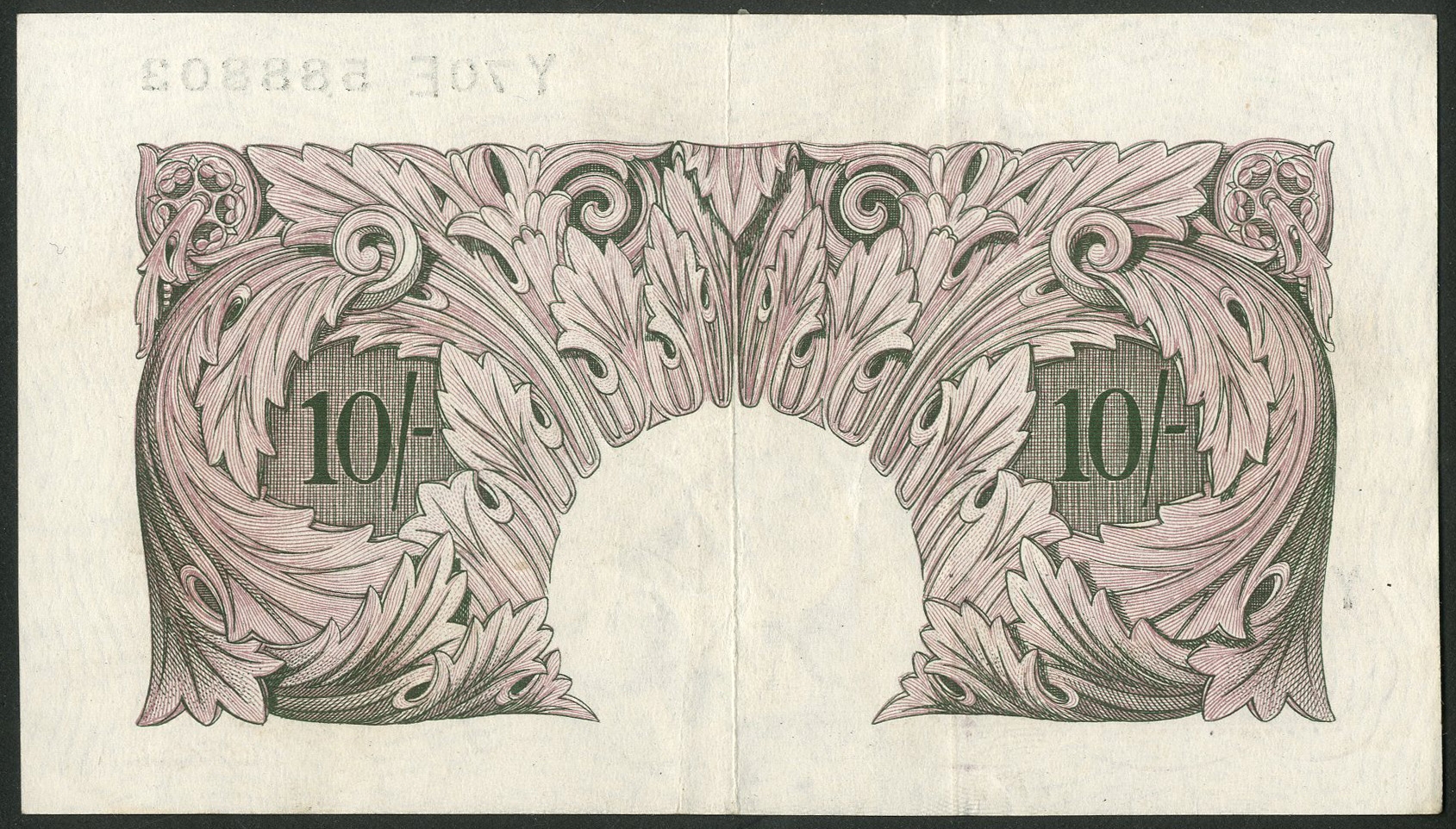 Bank of England, K. O. Peppiatt, 10 shillings, Emergency issue, (1940), #Y70E 588802 (EPM B251). Centre fold, AEF.