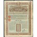 China: 1899 Chinese Imperial Railway 5% Gold Loan, £100, #19757, large format, brown, blue underprint, with 5 coupons, all of which have been used to restore the edges where there is some paper loss. Edges a little trimmed, F-AVF