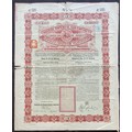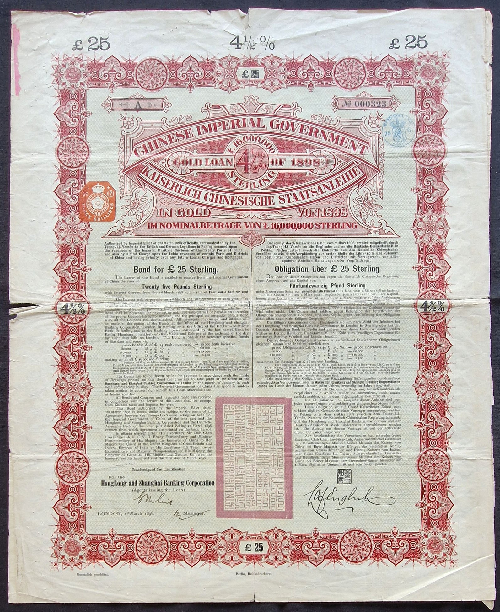 China: 1898, 4½% Gold Loan, £25 bond, #000323, issued by the Hongkong and Shanghai Banking Corporation, large format, ornate border, red and black, chop in centre, with coupons. Minor edge tears and split at centre fold, F-VF. Scarce