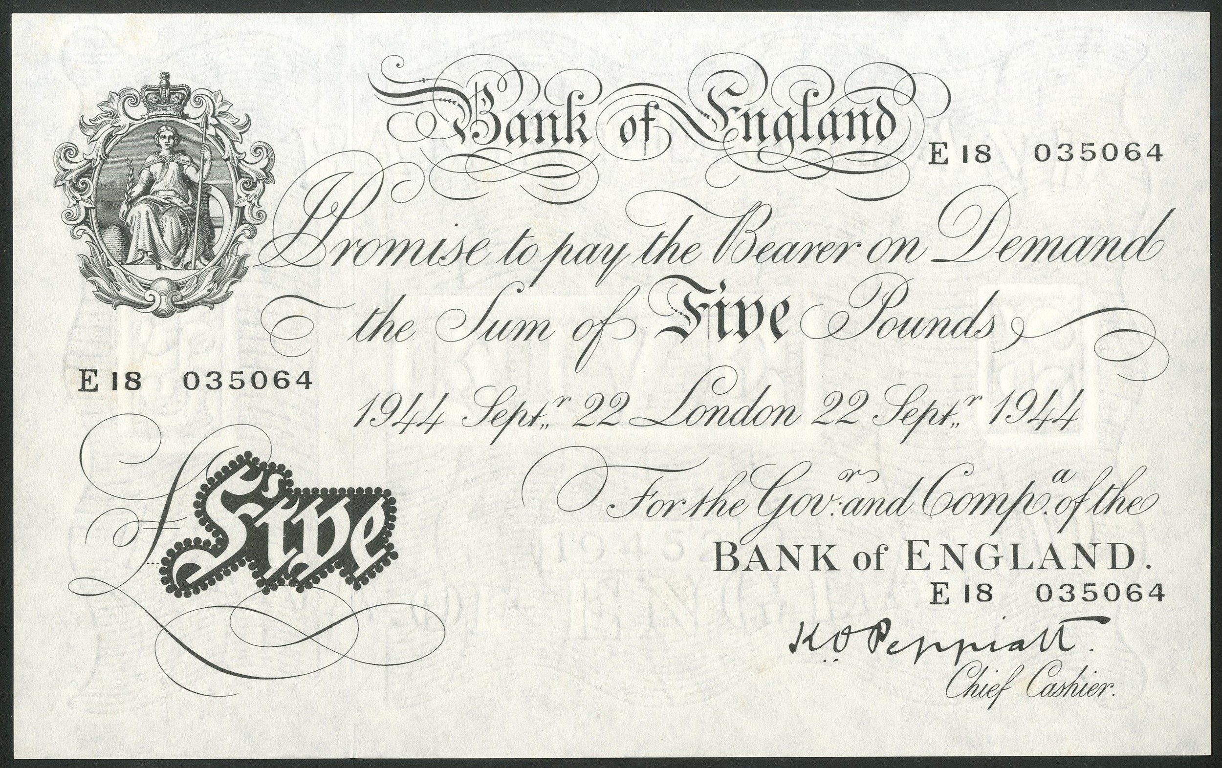 Bank of England, K.O.Peppiatt, 5 pounds, 22 September 1944, #E18 035064 (EPM B255). Virtually UNC and scarce thus.