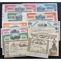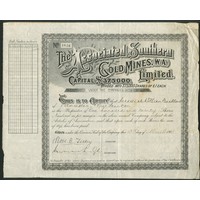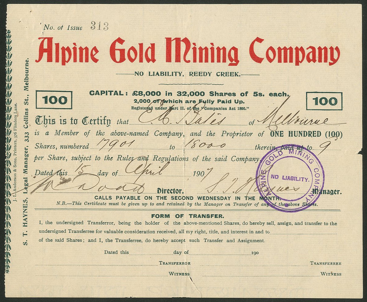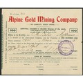 Australia: Alpine Gold Mining Company No Liability, 100 shares of 5/-, 190[7], #313, red and green. Mines at Reedy Creek, Victoria. Split at right edge, VF.