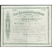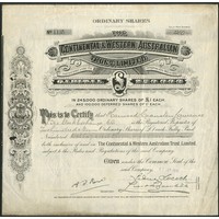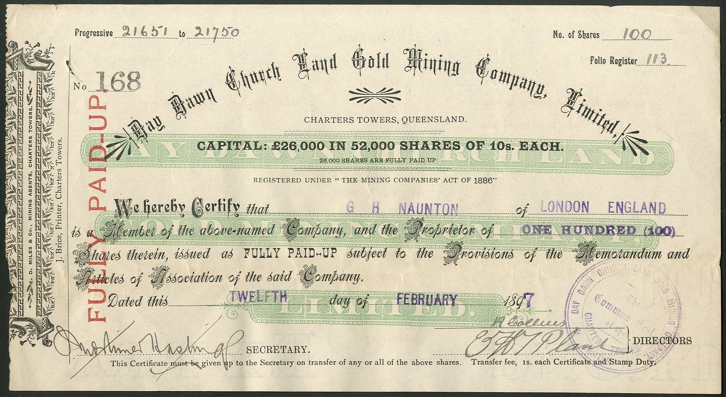 Australia: Day Dawn Church Land Gold Mining Company Limited, 10 shilling shares, 189[7], #168, black, green underprint. Mines at Charters Towers, Queensland. Rare locally printed certificate. Slightly uneven left edge otherwise near EF.